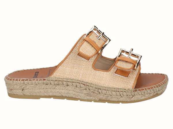 Zueco plano con piso de yute y puntera redondeada fabricada en tejido de la mejor calidad. Plantilla de piel acolchada y adorno hebillas. Cosidas a mano en España. Comodidad, durabilidad y versatilidad de un calzado 100% español. Cuenta con la garantía de Alpargatas Viguera.