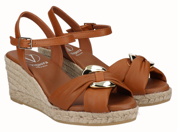Sandalia de cuña media de yute de 9 cm en la parte trasera y 1 cm en la parte delantera, fabricada en piel de la mejor calidad. Plantilla de piel acolchada. Cierre mediante hebilla para un ajuste óptimo. Incorpora adorno metálico delantero que le aporta un toque sofisticado. Comodidad, durabilidad y versatilidad de un calzado 100% español. Cuenta con la garantía de calidad de Alpargatas Viguera.